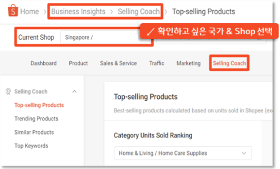 • 셀러센터 내 셀링 코치 기능에서 쇼피 판매/검색 데이터 확인